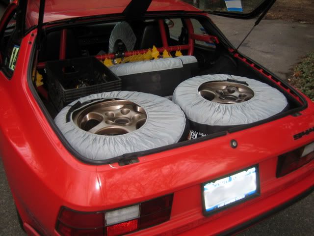 ![]() With the roll bar space is a bit more limited, but still can fit 4x 225/50/16's, a jack, four pieces of wood (car is to low for jack), tools and a milk crate for all my other odds and ends..