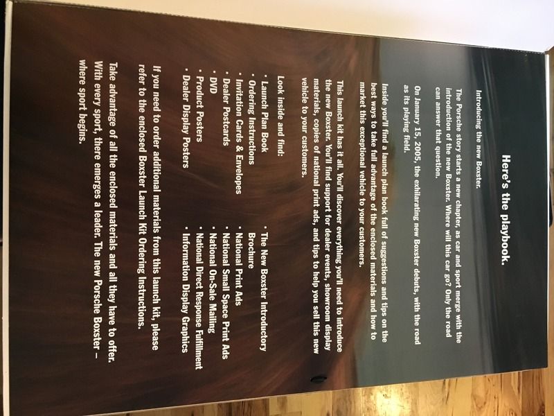Selling a 2005 Boxster launch kit. This is actually a pretty large piece about poster size that opens to reveal a number of launch items. contact me at cdillonc@aol.com for a fast response it is missing the n"New Boxster" Introductory Brochure
